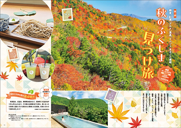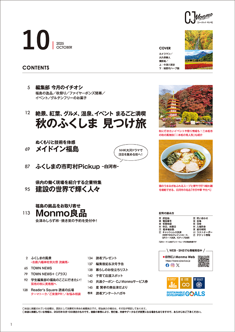 福島県のタウン情報誌「CJ Monmo」10月号のメイン特集『秋のふくしま見つけ旅』では、福島県内の紅葉する山々や秋の花といった絶景スポットをご紹介。旬の食材を使ったランチやスイーツ店、39市町村のイベント・祭り情報も掲載しているので、予定を立てるのに便利です。今しか出合えない福島の“とっておきの秋”を見つけに行ってみませんか?