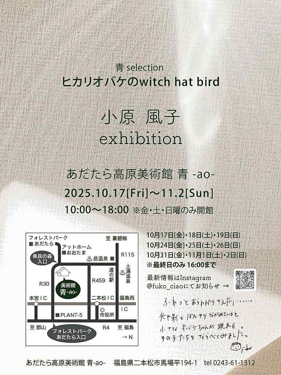 2025年10月17日〜11月2日まで(金土日のみ)あだたら高原美術館-ao-にて、小原風子exhibition『ヒカリオバケのwitch hat bird』を開催します。