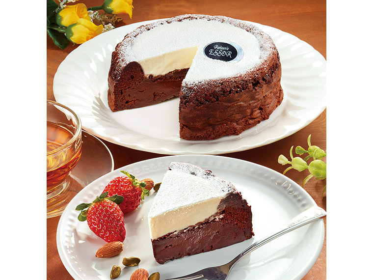 小麦粉を使わず、フランス「ヴァローナ」の高級チョコレートと卵でしっとり濃厚な味わいに仕上げた。まるで生チョコのような口どけ。