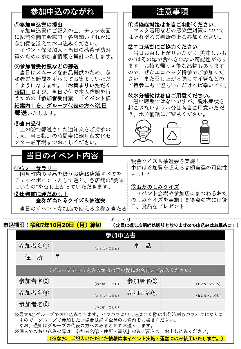 国見町商工会では、令和7年11月8日(土)に観月台文化センター駐車場・藤田商店街エリアを会場として、「第6回 くに味(み)でまんぷく!ウォー食(ク)ラリー」を開催します。