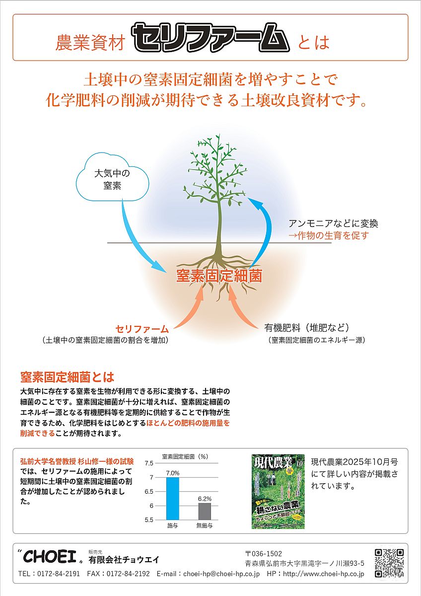 福島天香園では、作物の成長に役立つ農業資材「セリファーム」を販売しています。