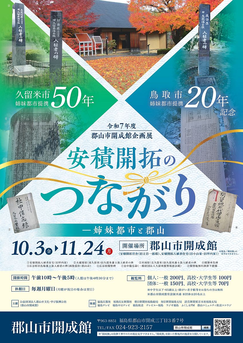 郡山市開成館は、令和7年度秋の企画展「安積開拓のつながり-姉妹都市と郡山」を記念した講座を、11月13日(木)に開催します。会場は、郡山市のミューカルがくと館です。