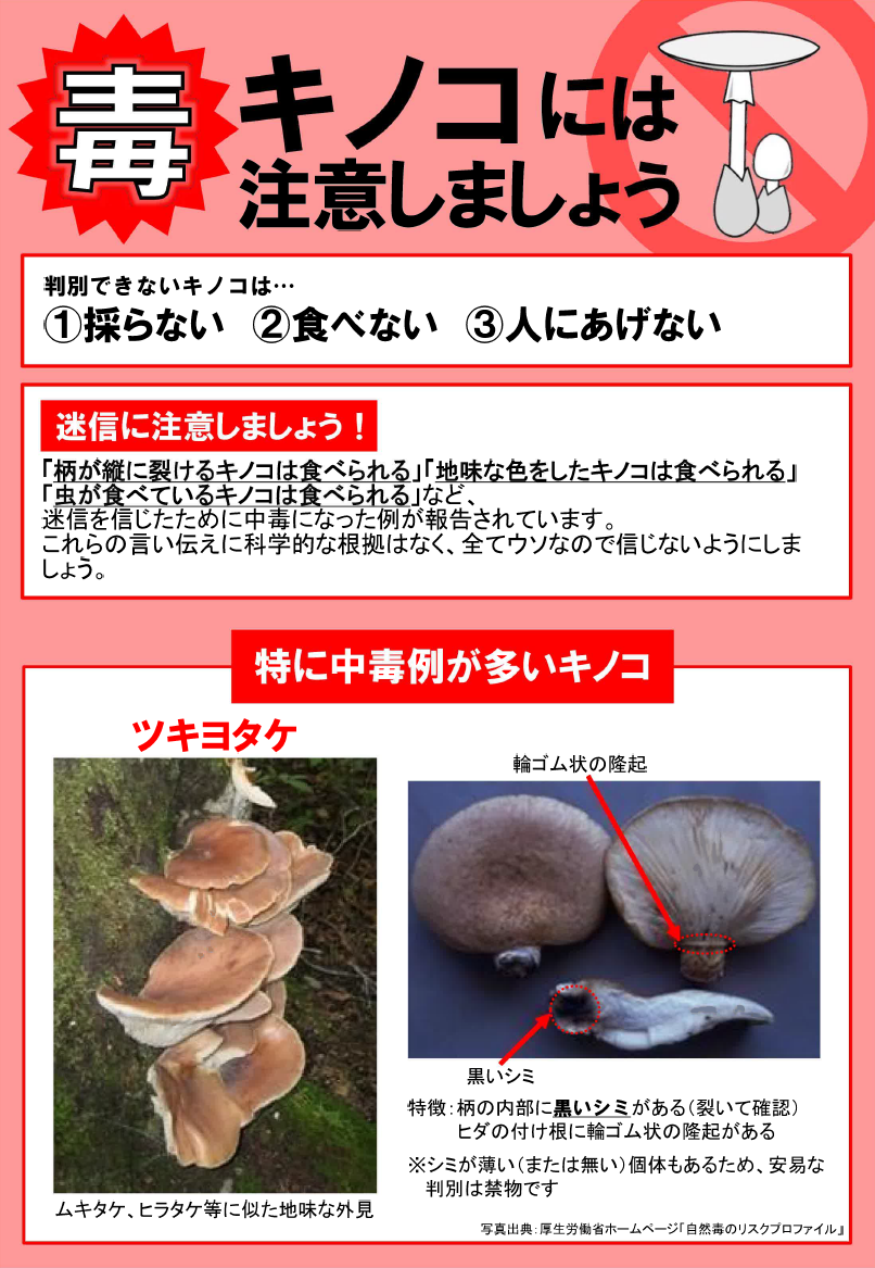 毒キノコによる食中毒が発生しました。ぐれぐれも注意しましょう。3名が嘔吐、下痢の症状。