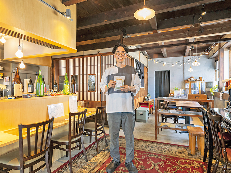 「ここに集まる人が楽しい時間を共有してほしい」と話す祐輔さん。懐かしくて温かい空間で、こだわりのこんにゃく料理をゆっくり堪能できる。DJブース型のカウンターを囲み、客同士の交流も生まれている。