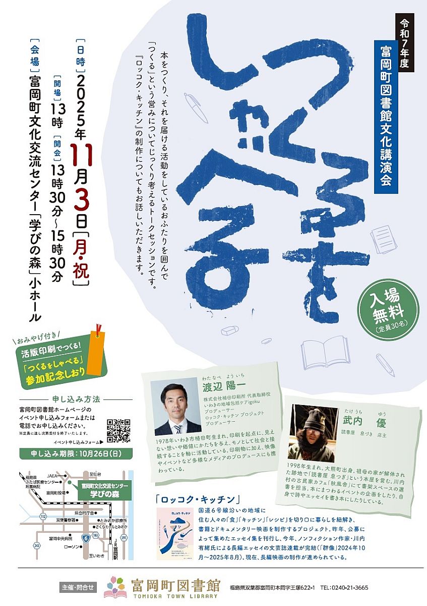 - 11月3日、文化講演会「つくるをしゃべる」を開催します!【富岡町図書館】(Postbox-newsR Provided by Like-s)- 2025.10.29(水) 12:00