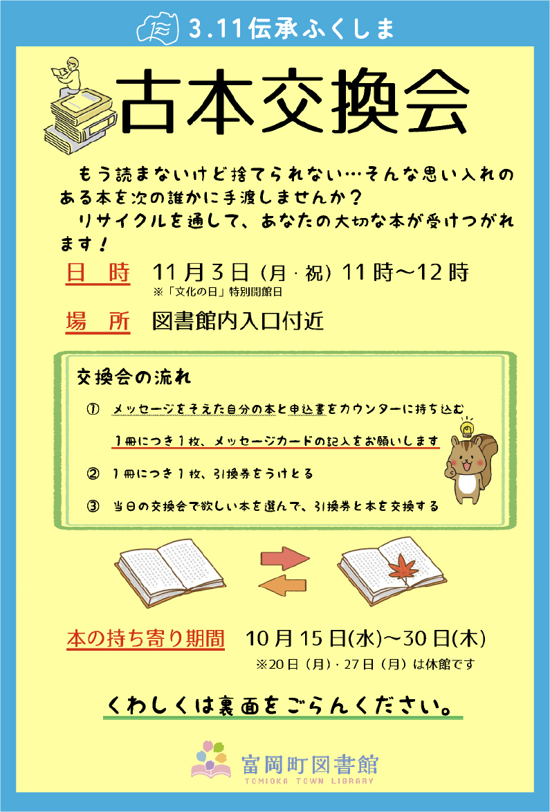 - 【イベント情報_11月】富岡町図書館/秋の読書週間イベント(古本交換会)開催します(3.11伝承ふくしま事務局)- 2025.10.29(水) 16:00