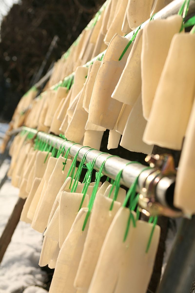 “Shimi-daikon” (freeze-dried Japanese radish) is a traditional winter food. Daikons harvested in the fall are peeled, lightly boiled, sliced, and then threaded onto long bamboo skewers. Each skewer is hung on an outdoor drying rack to air-dry. To be honest, when I first saw the sliced “shimi-daikon”, I thought it was a loofah sponge. Another method involves piercing holes in the daikons, threading a string through, and hanging them outside. I've helped make “shimi-daikon” this way, and it was physically exhausting – it made me appreciate the value of freeze-dried foods.