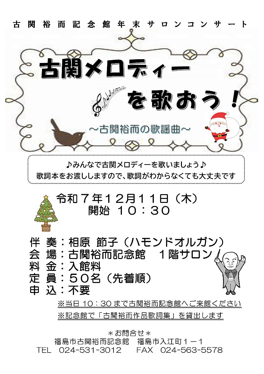 令和7年12月11日(木)、福島市古関裕而記念館にて、年末サロンコンサート「古関メロディーを歌おう!~古関裕而の歌謡曲~」を開催します。