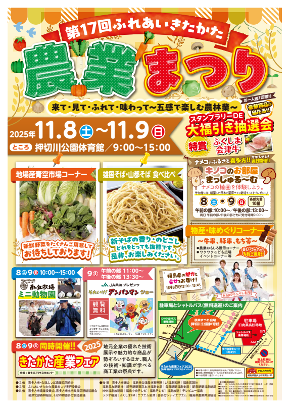 また、「きたかた産業フェア」が喜多方プラザ文化センターで同時開催。地元企業の技術展示や特産品販売が行われ、地域の農業と産業のつながりを楽しんで。