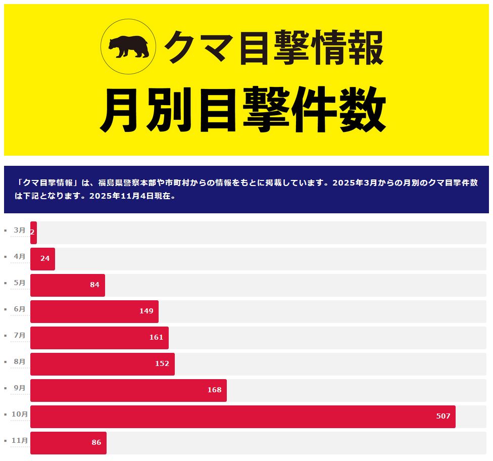 - 11月は10月を上回るペースでクマの目撃が激増しています。くれぐれもご注意ください。(ラジオ福島)- 2025.11.05(水) 08:28
