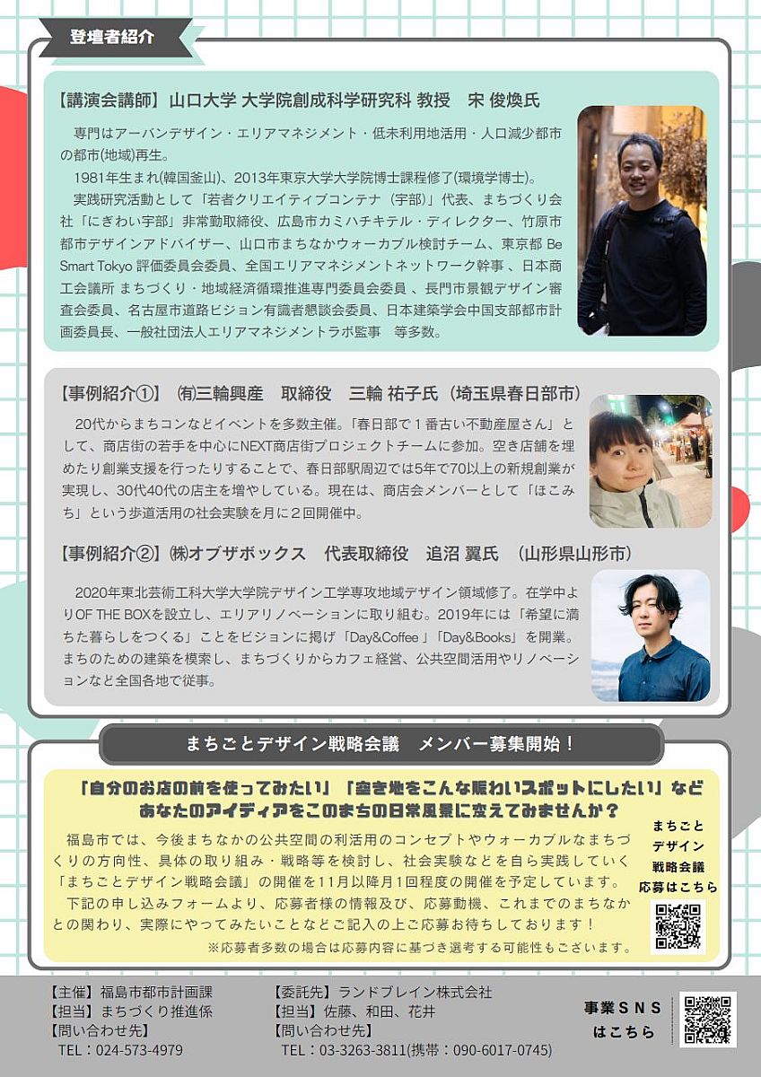 福島駅周辺のまちのこれからについて、市民一人ひとりがまちづくりへの関わり方を考え、ウォーカブル(歩きやすい)なまちづくりの機運を高めるとともに、他市事例を学ぶためのセミナーを開催します。全国各地でまちづくりに携わる方を講師としてお迎えし、ウォーカブルなまちづくりのヒントを探ります。第1回目は、山口県・埼玉県・山形県にて、それぞれの現場で活躍されている3名が登壇します。まちなかの未来について、一緒に考えてみませんか?戦略会議メンバーも募集中です!