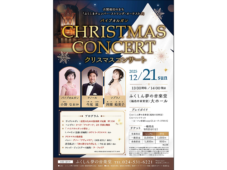 「ふくしん夢の音楽堂(福島市音楽堂)」が誇るパイプオルガンの音色を楽しめる、毎年恒例のクリスマスコンサート。2025年はパイプオルガン・小野なおみ、テノール・今尾 滋、ソプラノ・阿部絵美子、そして「古関裕而のまち ふくしまチェンバー・ストリング・オーケストラ」が出演。心に響く音楽とともにクリスマスを彩る。