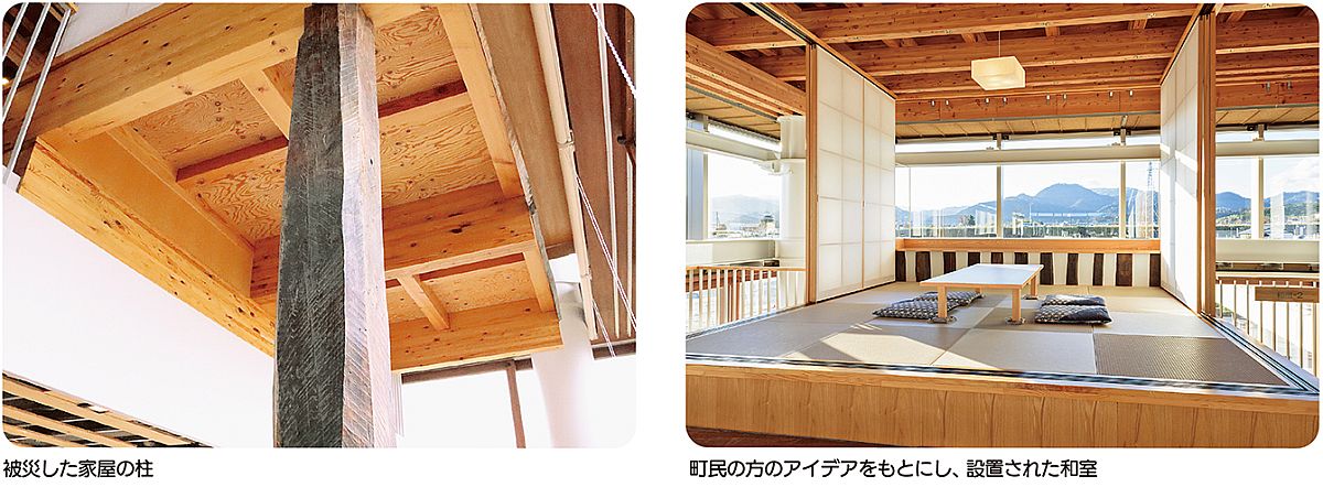 本施設は町民の方との「お茶飲みワークショップ」で出たアイデアをもとに建設されました。多目的室・広場・サウンドルーム・ワークスペースなど、町民が交流をしたり、町の情報を発信しています。楢葉町が経験した震災を伝えるため、津波で被災した家屋の柱などを施設の一部に使用しています。復興までの歩みを紹介するパネル展示など、震災の記憶と記録を後世につないでいく施設です。