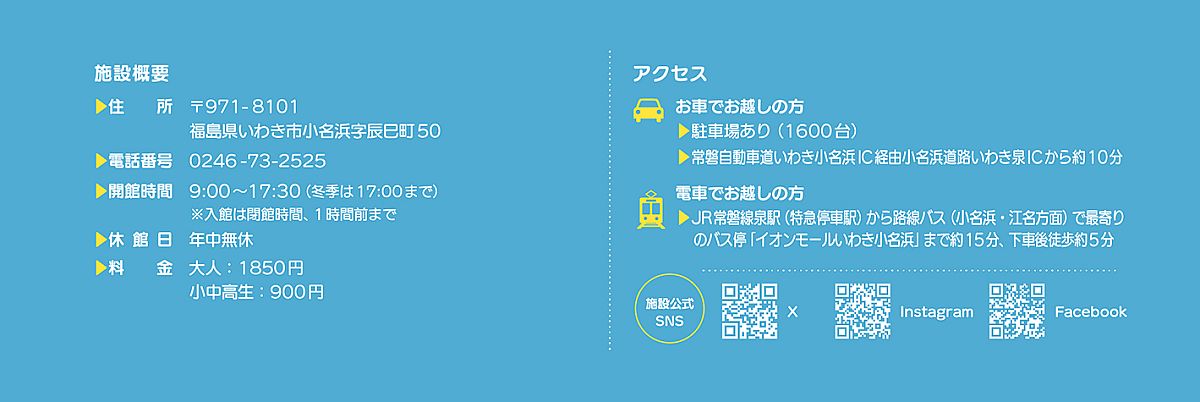 福島県の沖合にあらわれる黒潮と親潮が出あう「潮目の海」がテーマの水族館。三角形のトンネルが印象的な大水槽「潮目の海」をはじめとして約800種の生物を展示。森や海辺の自然を再現した屋外の体験型展示エリア、自分で釣った魚をその場で食べる「釣り体験」など様々な体験ができます。東日本大震災後、約4ヶ月後に営業を再開。震災後の状況や再オープンまでの様子をシアターなどで説明しています。(※団体対象・事前予約制)