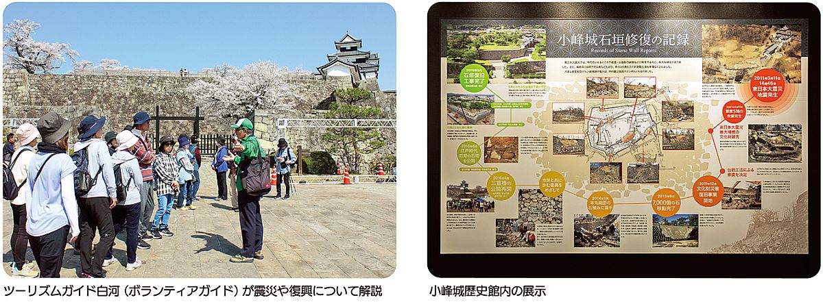 小峰城は、東日本大震災により10箇所にわたり石垣が崩落するなど、被災した文化財の中では最大規模の被害がありました。その後、伝統工法による石垣修復工事が行われ、令和元年(2019)に完了しました。公園内にある史跡小峰城跡のガイダンス施設「小峰城歴史館」には、小峰城の歴史を解説したパネルや模型、VRシアターなどの展示があります。また、展示の一部において、震災発生から修復完了までの経過をパネルや映像などで紹介しています。