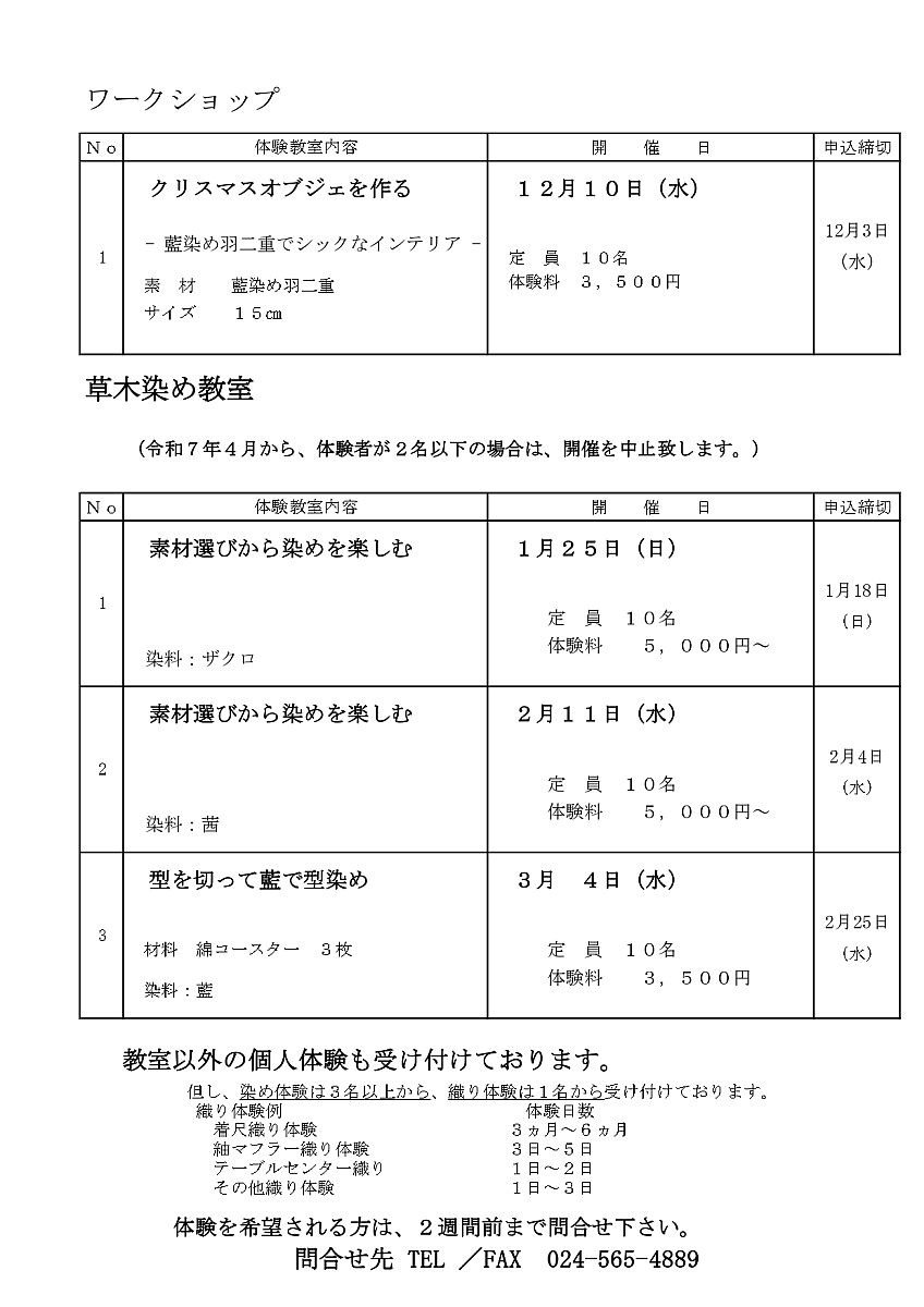 【からりこ館】手織り・草木染めの体験教室(12~3月)のご案内