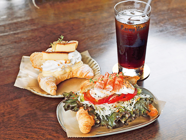 店の看板メニューはクロワッサンサンド。香ばしく焼き上げたクロワッサンに様々な具材を合わせた、見た目も華やかな一品だ。クリームやフルーツ、チーズケーキなどをトッピングしたスイーツ系、たっぷりの野菜に玉子やハム、エビなどを挟んだ食事系が各7、8種類揃う。