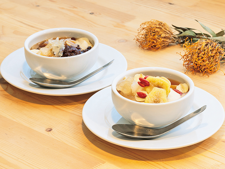 写真は、季節のもの(写真右)と定番の2種類の豆花。きび砂糖を焦がして香ばしさを出したシロップは、甘さ控えめでお茶との相性も抜群。