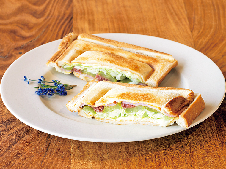 写真はピクルス、コンビーフが入った「ホットサンド(キューバのそよ風)」(650円)。