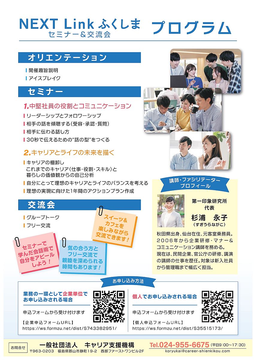 若手・中堅社員のキャリア向上やライフデザイン形成を応援する「セミナー&交流イベント」を福島県の浜・中・会津エリアの3会場で行う。