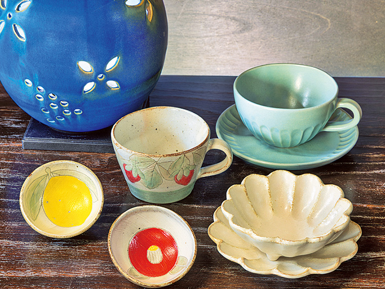 敷地内の「うつわや 花梨」には、窯元から直接買い付けた、素朴で温もりある陶磁器が所狭しと並ぶ