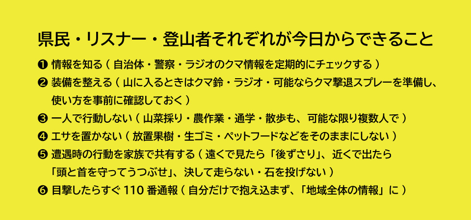 10月21日(火)に「ラジオでしょう」内で放送した『「緊急特別企画・特集「クマ来ないで!」テキスト版 Q&A」』をクマ目撃情報特設サイトに掲載しました。21項目にわたるクマに関するテーマをQ&A方式で掲載しています。望月准教授の話をもとに、県民・リスナー・登山者それぞれが今日からできることを整理すると、