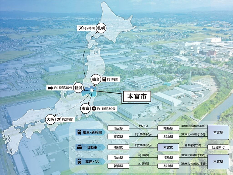新幹線なら東京都から約1時間30分、宮城県仙台市からは約1時間で到着。最寄り駅はJR本宮駅となります。高速道路の場合、最寄りのインターチェンジは東北自動車道本宮ICです。