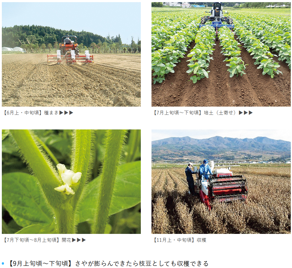 福島県では、「タチナガハ」や「里のほほえみ」等を奨励品種としており、県内各地で生産しています。県産大豆は、味の良さや多様な品種等で評価されており、県として作付けの団地化や機械導入による生産拡大と併せて、更なる品質向上を推進しています。