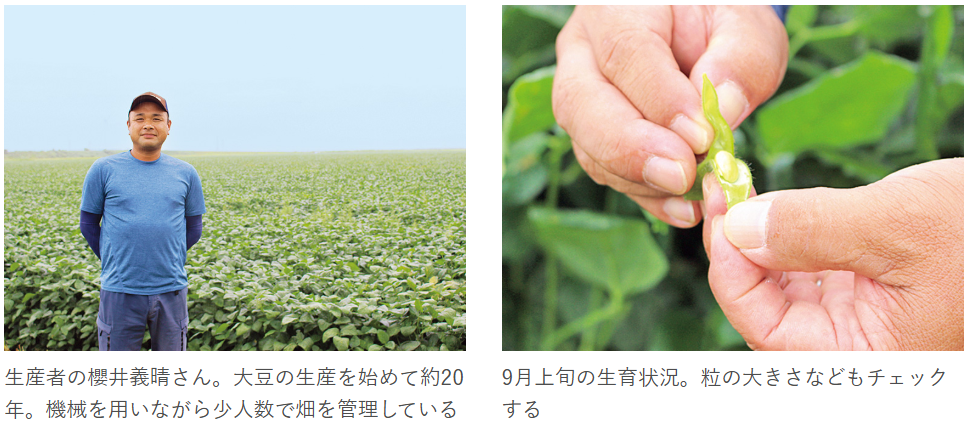 南相馬市鹿島区で稲作と畜産を行い、12haの畑で「里のほほえみ」を育てる。大豆は比較的暑さに強いが、水分の管理が重要。花が咲く7月下旬から8月上旬は特に水分を要するため、天候や畑の様子、生育状況を観察して、管理を徹底。農家の高齢化が進む中、同地区には活躍する若い世代も多く、日々情報を交換しながら品質向上や収量アップに励んでいる。