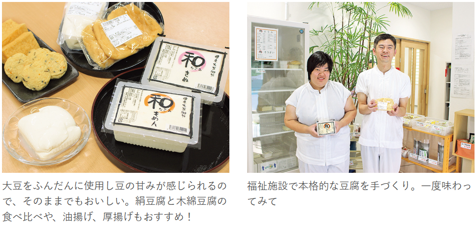 福島県産の「里のほほえみ」を使用して豆腐づくりを行う『和』。地産地消を大切にしたいという思いから、創業時より県産大豆を使用している。豆乳から手作りしており、豆腐は濃度15%以上と豆の味が濃いのが特長。