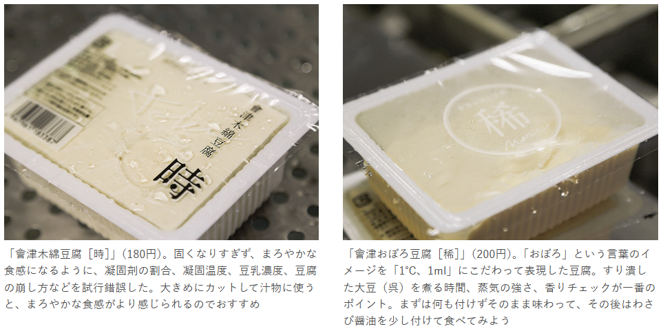 「時間に追われるとおいしい豆腐ができないので、前日の準備をしっかり行い、毎日作ることだけに専念できるようにしています」と代表の奥村さん。地元の大豆にこだわってつくった豆腐は、会津地区のスーパーや道の駅などでも買えるので、この機会にぜひ味わってみて。