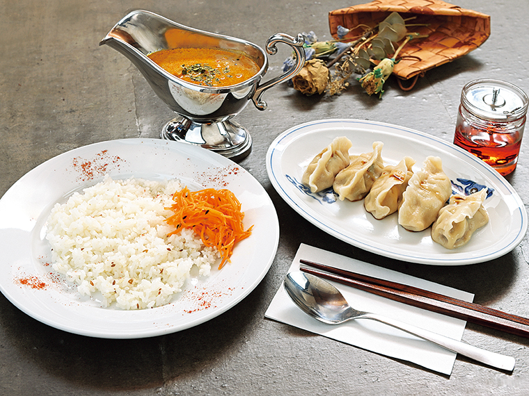 写真はスパイスが香るココナッツミルクベースの 「ケララチキン」(850円)と「水餃子」(480円)は、営業時間中ならいつでも注文でき、ランチ難民にもうれしい。