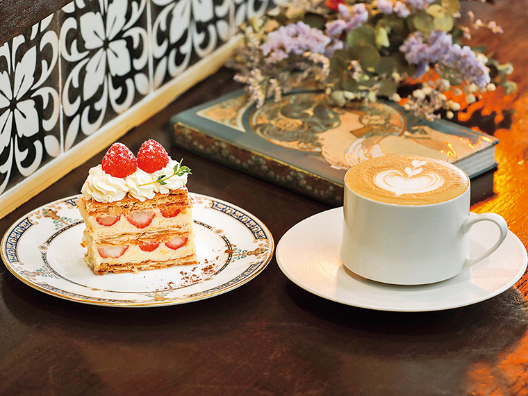 写真はサクサクのパイにバターがきいたクリームとイチゴを挟んだ「苺のミルフィーユ」。スパイスが香りのアクセントに。ラテアートもうれしい「焚き火ラテ」とともに(各800円)。
