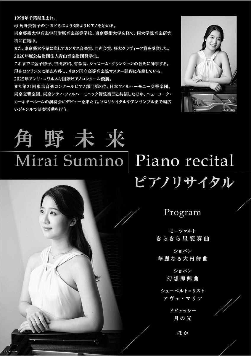2026年2月8日(日)、福島市のふくしん夢の音楽堂で、「角野未来ピアノリサイタル」を開催します。国内外のコンクールで多数受賞歴を持つ気鋭のピアニスト・角野未来さんの演奏を、福島で聴ける貴重な機会です。
