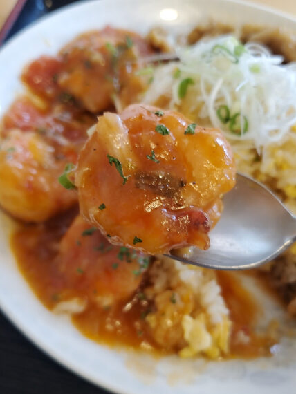 エビの頭を裏漉しして取る出汁といわき市産トマトの特製チリソースが、ジャンボなエビに纏わりついて堪らないほどにコク爽やか。