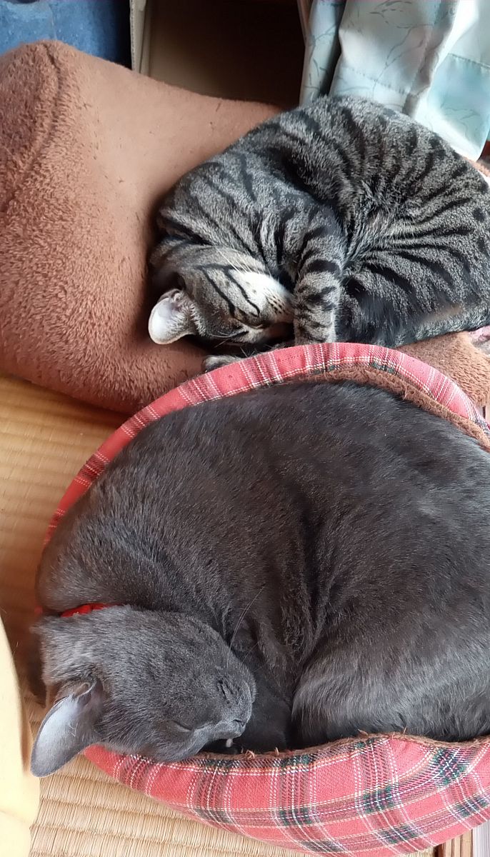 我が家の保護にゃん ミーコ(推定11才・女の子・雑種灰色)、ごんた(推定3才・男の子・雑種キジトラ)です。 とても仲が良いのですが一日一回はド派手なニャンプロをします。仕掛けるのはごんたですが、毎度ミーコの圧勝です(笑) スマイル猫部入部希望で~す!
