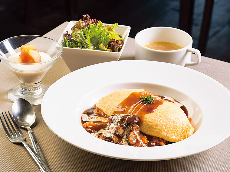 1番人気の「オムライス」は、チキンライスの上にオムレツを乗せて牛すじ入り自家製デミグラスソースを贅沢にかけた一品。創業から継ぎ足しで作り続け、牛すじや牛骨、セロリやニンジンなどの野菜をじっくり煮込んだソースはうまみがたっぷり。