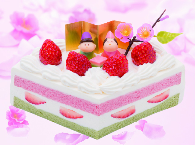 ふわふわのスポンジとコクがあり口どけのよい生クリームで甘酸っぱい苺をサンドし、ひなまつりの飾りでかわいらしく仕上げました。