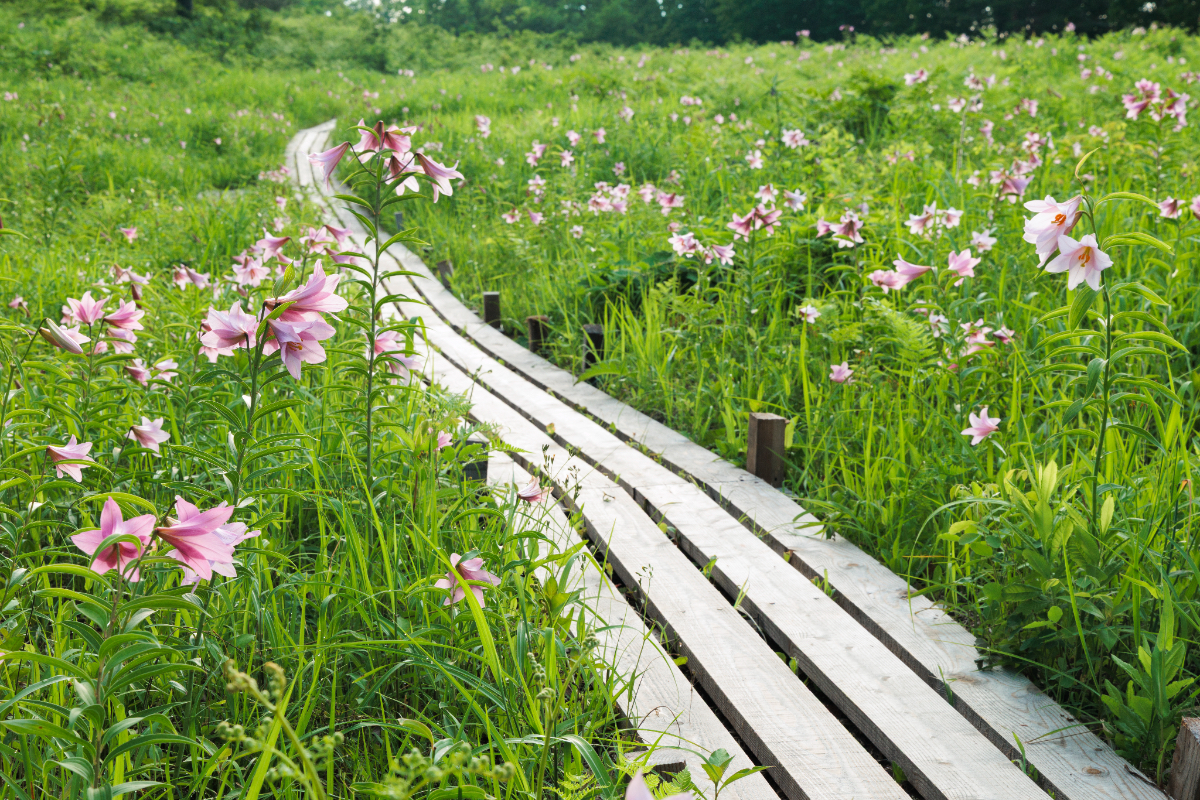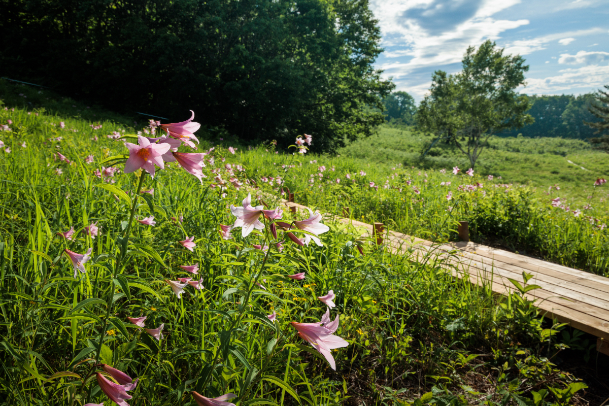 A.35年ほど前から、高清水自然公園のヒメサユリの種を南郷スキー場に蒔いて、南郷地区の象徴でもある花畑を広げてきました。観光で町を訪れる皆さんに、より気軽にヒメサユリを楽しんでいただこうと町が取り組んでいます。南郷スキー場と比べると高清水自然公園の群生地は、花をきちんと保護した上で皆さんに鑑賞していただいています。南郷スキー場が先に見頃を迎え、その後に高清水自然公園が続くので、ヒメサユリの花ぶりを見比べてみるのも楽しいと思います。