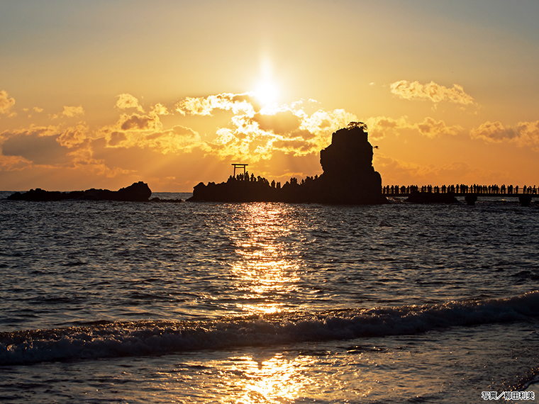 岩の上に立つ小島「弁天島」の近くからは、朱塗りの鳥居越しに昇る太陽の幻想的な姿を眺めることができ、撮影スポットとしても人気だ。