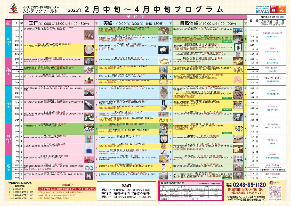 ムシテックワールドの2026年2月中旬~4月中旬プログラムができました。予約開始日をご確認のうえ、お申込みください。人気の講座やプログラムは早めのご予約がおすすめです。