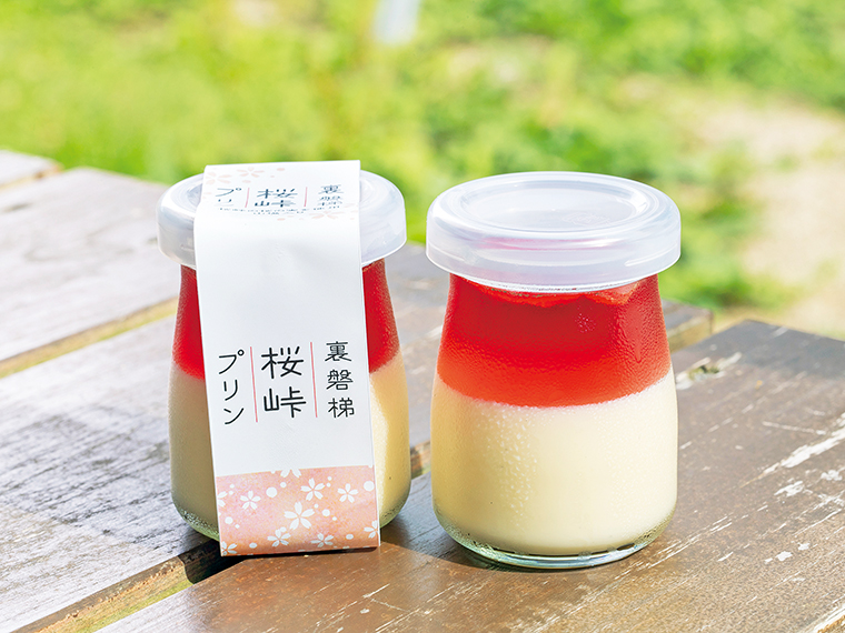 人気商品は「裏磐梯桜峠プリン」。桜峠のオオヤマザクラの実を収穫し、香り豊かなぷるぷるのゼリーに仕上げた。山塩がきいた、ほんのり甘じょっぱいカスタードプリンとの相性も抜群。