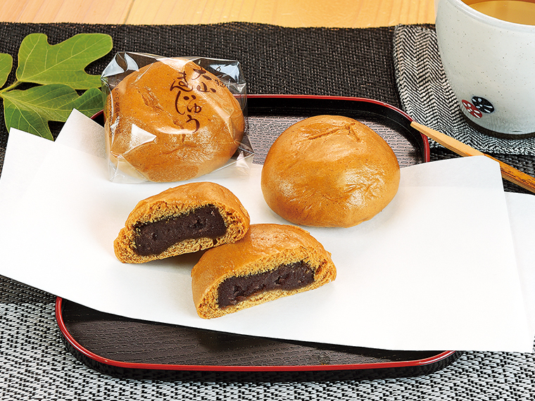 人気商品は「大山まんじゅう」。町の代表的な観光スポット「大山祇神社」の参拝記念に買い求める人が多数。黒糖を混ぜた優しい甘さの皮と、なめらかなこしあんの素朴な味わいで愛されている。
