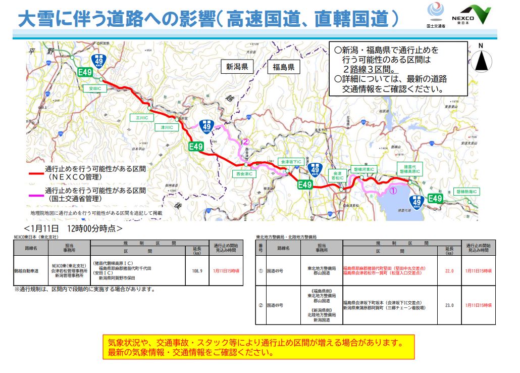 1月11日16時頃から、磐越道、国道49号で、大雪の影響により予防的通行止めを実施する可能性 。