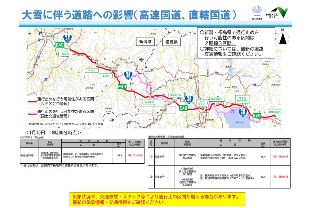 - 1月11日16時頃から、磐越道、国道49号で、大雪の影響により予防的通行止めを実施する可能性 。(ラジオ福島)- 2026.01.11(日) 08:30