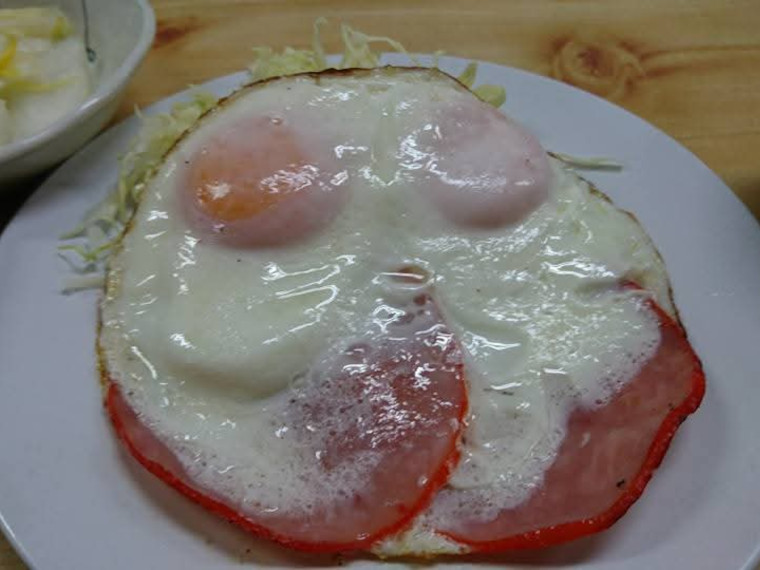 ハムエッグは赤いプレスハムと目玉焼きの2ペア。ハムの配置をマイナーチェンジしたハムエッグはさらにご馳走感が増しました。