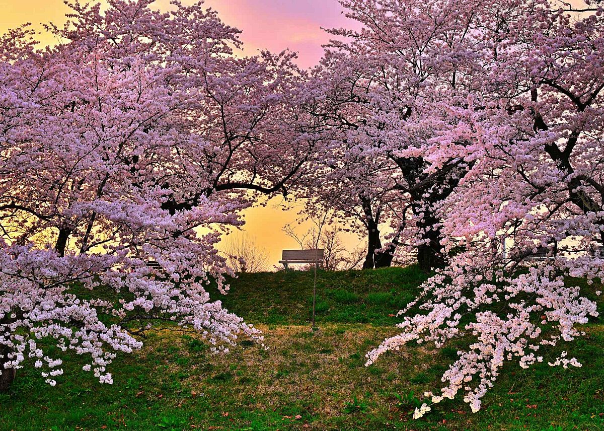 「題名は、妻に大笑いされましたが「恋人たちの予約席」としました。理由は夕焼けの中、桜がハートに見えその真ん中の長椅子が恋人たちには最高の席で、予約しないと座れないような感じだったんですが、どうですかね?」
