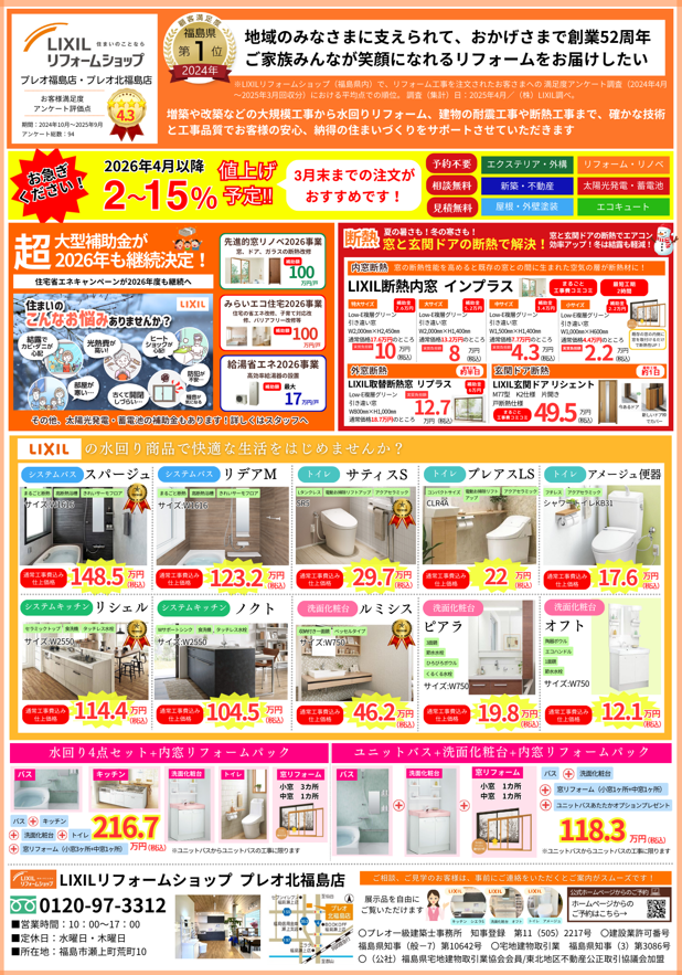 プレオ福島店では、2026年も継続される住宅省エネキャンペーンなどの補助金を活用しながら、お得にリフォームしていただける水まわり&内窓リフォームプランをご用意しています。