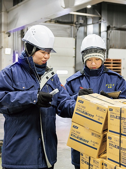 倉庫内に保管する冷蔵、冷凍商品の管理は重要な業務。そのための検品も欠かせない。