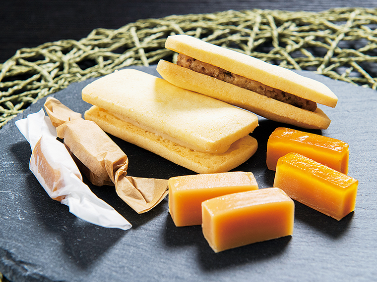新鮮な牛乳と生クリームで手作りする、大玉村の『向山製作所』の代表作「生キャラメル」。『モンモ良品』では、表面をカリッとキャラメリゼした1番人気の「カラメル」、濃厚なミルク風味の2番人気の「ノースミルク」をお届け。